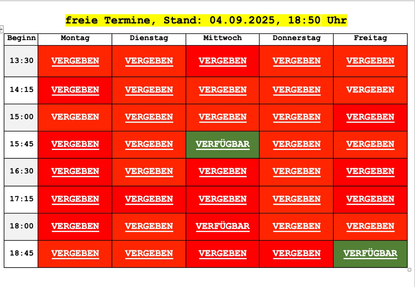 Die grün unterlegten Termine sind aktuell noch verfügbar: